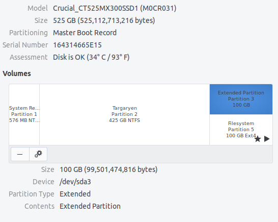 Я использую диск 525 ГБ с двойной загрузкой с Ubuntu 18.10 и Windows 10. Мой раздел Windows должен быть 425 ГБ, а мой раздел Ubuntu должен быть 100 ГБ, но я вижу две записи, отличные от NTFS: