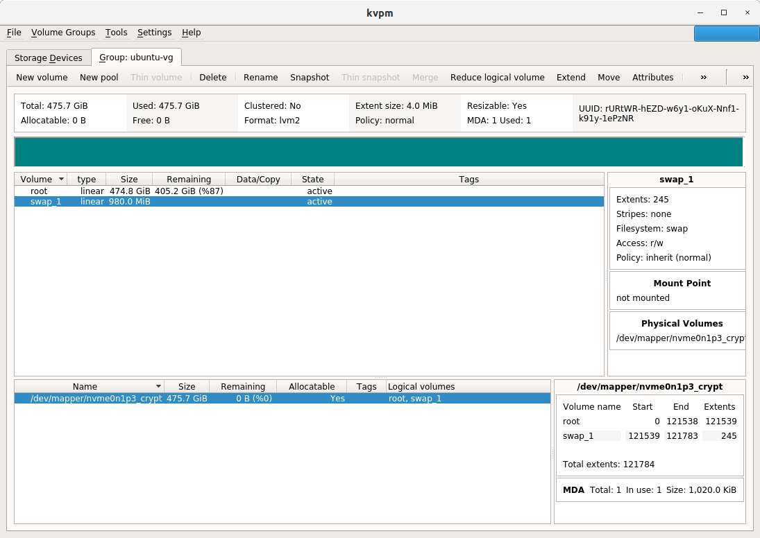 Если принятый ответ слишком сложен, вы также можете просто позволить установщику сделать свое дело, затем загрузить Ubuntu и установить диспетчер LVM. kpvm. С его помощью вы можете удалить swap раздел и измените размер корневого раздела, чтобы использовать это пространство.