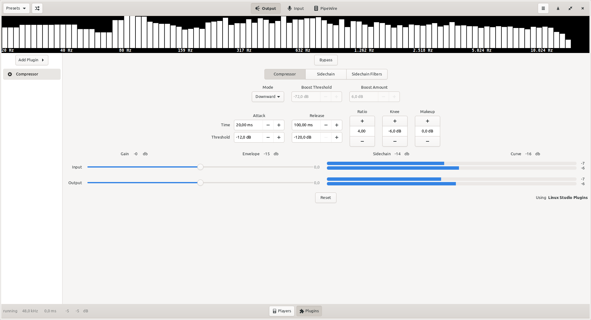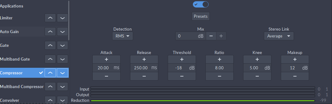 Чтобы поэкспериментировать с различными параметрами, я также загрузил компрессор как настраиваемый плагин ALSA в реальном времени через Alsaequal. создавая следующее