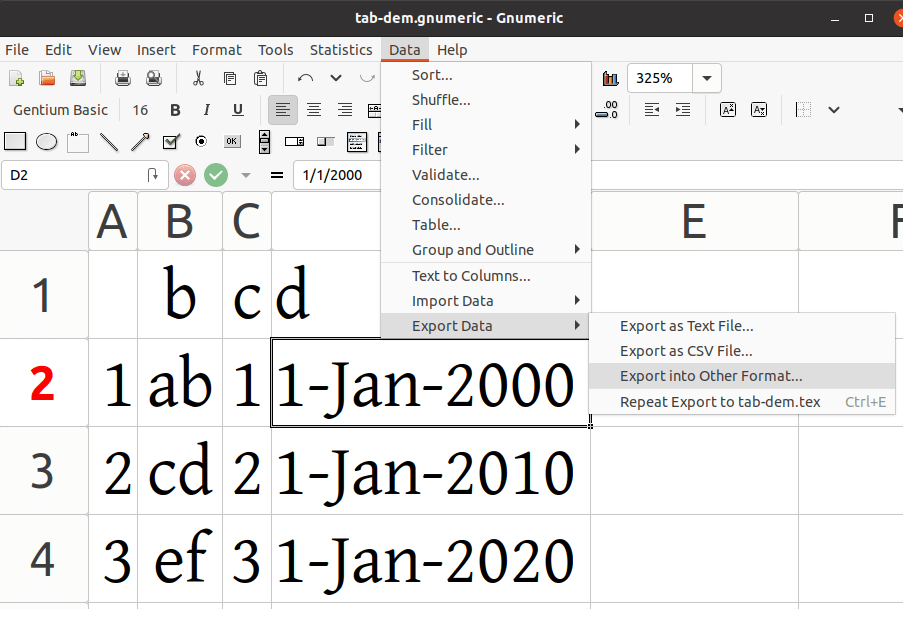 Это может быть несколько громоздко, поэтому, если конечный результат будет .tex Я обнаружил, что проще всего сохранить форматирование gnumericТаблица к минимуму (например, игнорировать выравнивание столбца, хотя дата форматирования это полезно, как указано выше) и экспорта, как Latex 2e table fragment, как показано ниже, что скорее "голые кости". Редактирование .tex вручную позволяет использовать дополнительные тонкости, такие как пакет booktabs.