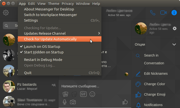 Если вы нажмете ОК и приложение не запустится, перейдите в каталог приложения (вы можете узнать его, набрав which messengerfordesktop) и попробуйте запустить приложение от имени пользователя root. Приложение запустится, затем снимите флажок "Проверять наличие обновлений автоматически", как предложено pa4080. Это решило проблему на моем Kubuntu 18.04.