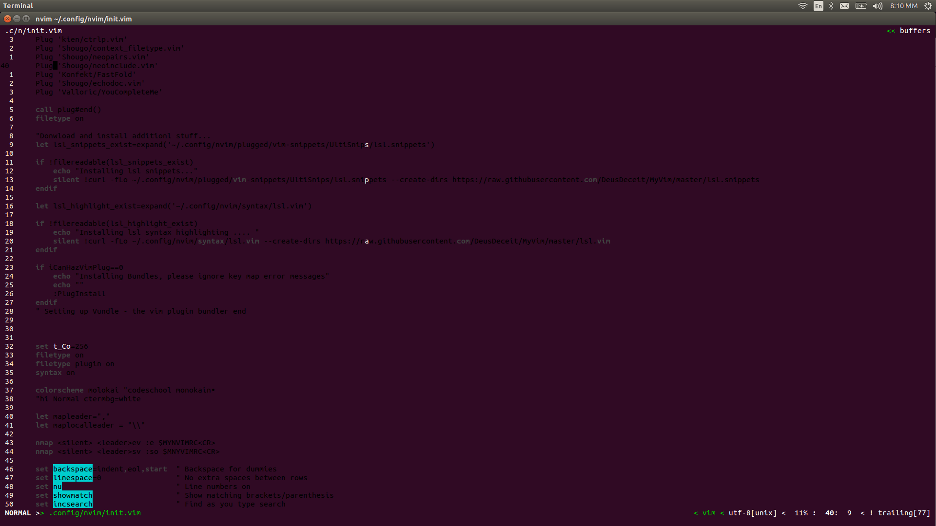 Я использовал neovim в archlinux и цвета работали нормально, я использовал rxvt-unicode и zsh. Я пытаюсь сделать то же самое в Ubuntu, но цвета выглядят как дерьмо. Это темные и не правильные цвета. Любые идеи, как это исправить?