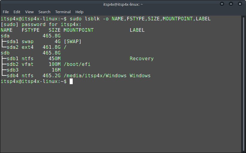 sudo lsblk -o NAME,FSTYPE,SIZE,MOUNTPOINT,LABEL