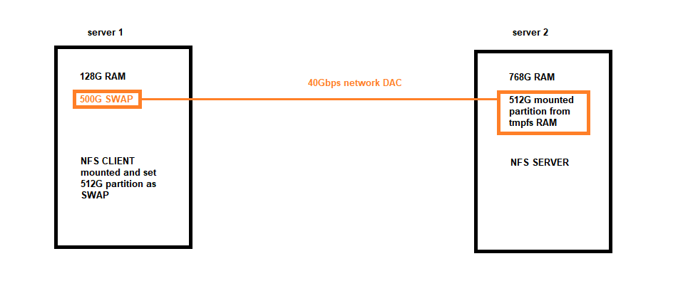 Поэтому я смонтировал раздел из 512 ГБ ОЗУ на втором сервере и использовал NFS-сервер, чтобы мой первый сервер мог получить к нему доступ в качестве клиента. Между этими двумя серверами установлено соединение со скоростью 40 Гбит/с, поэтому мне достаточно скорости для проведения теста. На первом сервере я смонтировал раздел NFS со второго сервера и создал на нем файл подкачки, и я был готов к работе с 128 ГБ оперативной памяти и 512 ГБ подкачки.