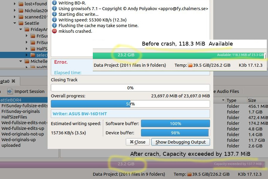 Этот сбой, по-видимому, происходит с почти полным проектом данных Blu-Ray K3b, как раз в тот момент, когда он заканчивает запись, и прямо перед тем, как обычно начинается проверка правильности записи файлов. Моя работа заключается в том, чтобы оставить больше свободного места, чем нужно. См. вложение:изображение показывает: 23,2 ГБ используется и 118,3 МБ доступно, затем сбой показывает те же 23,2 ГБ, но емкость превышается на 137,7 МБ. Это заставляет меня думать, что что-то не так с тем, как рассчитывается начальное доступное дисковое пространство.