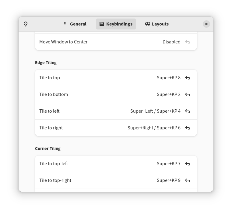 В открывшемся окне перейдите на вкладку Keybindings и перейдите к Edge tiling: