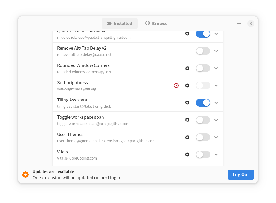 Перейдите на вкладку «Установлено» и нажмите кнопку шестеренки рядом с Tiling Assistant , чтобы открыть настройки расширения: