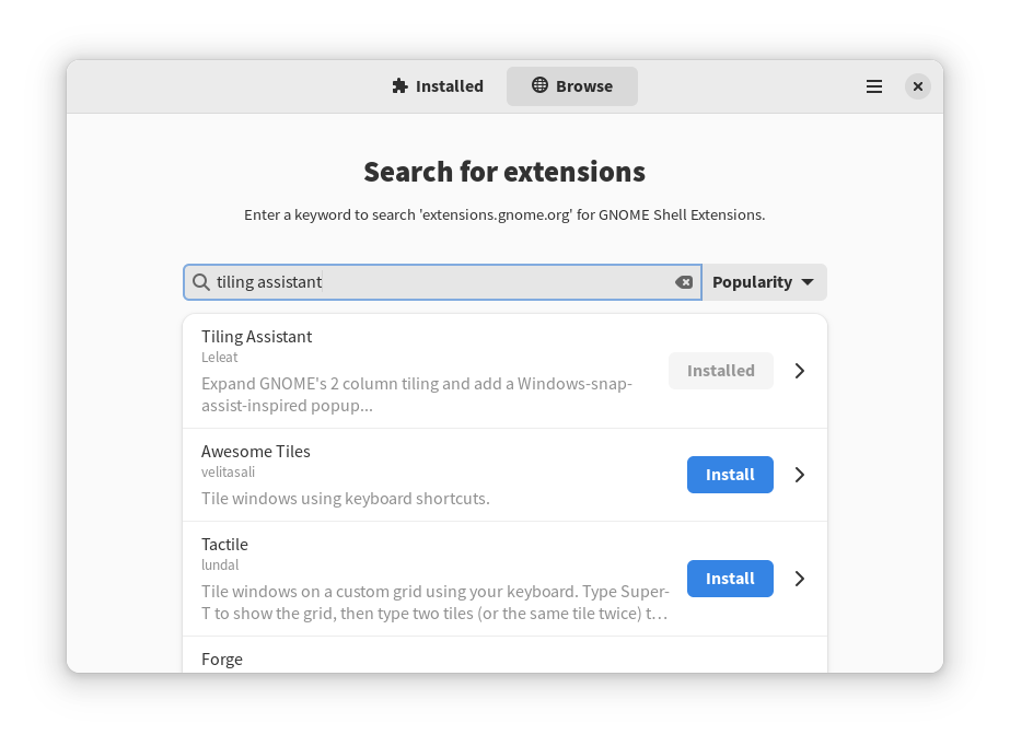 Найдите «tiling Assistant» и нажмите «Установить» , чтобы установить расширение (я уже установил его на скриншоте):
