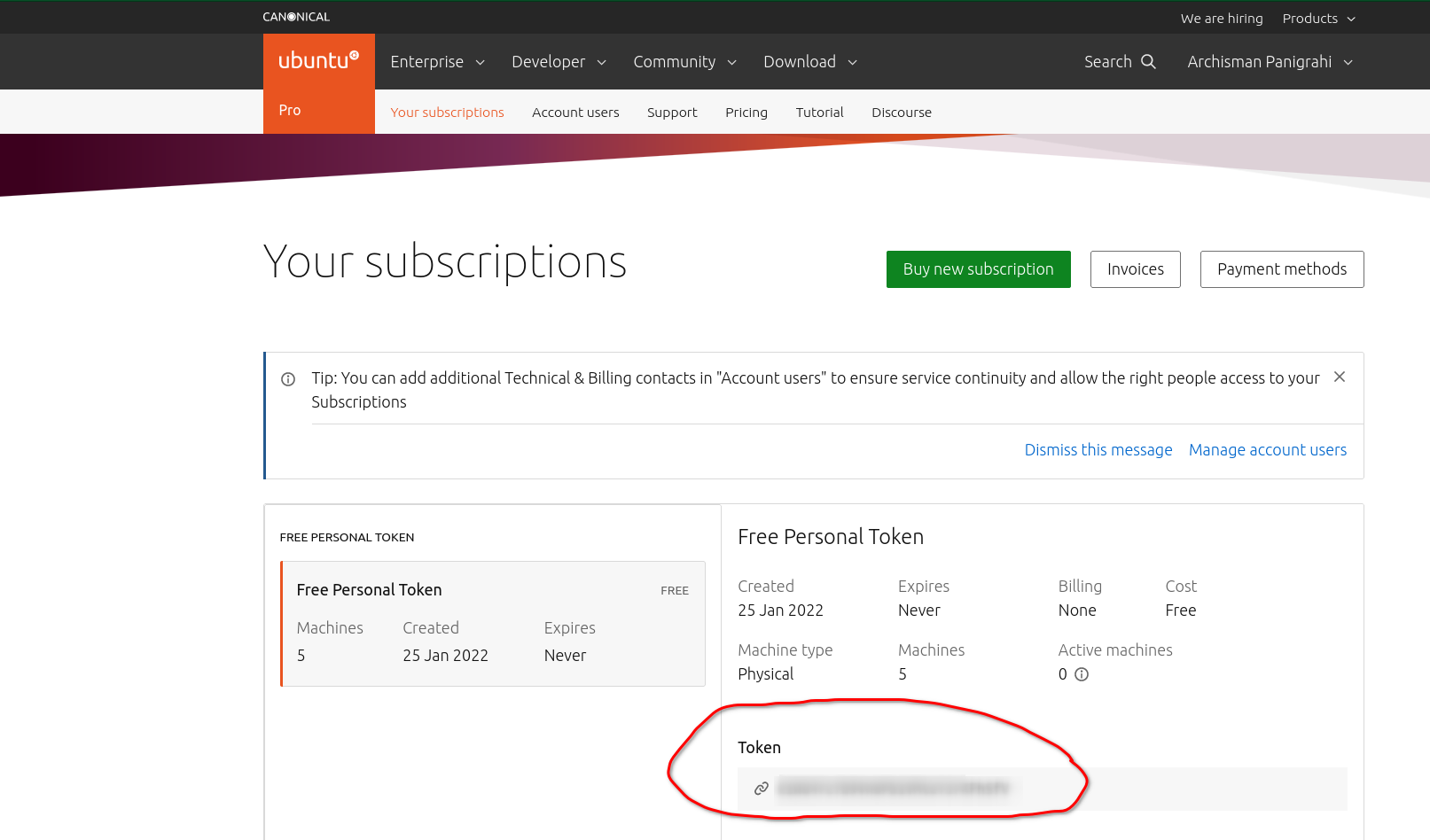 Откройте https://ubuntu.com/pro/dashboard, перейдите в раздел «Ваши подписки» и получите токен.