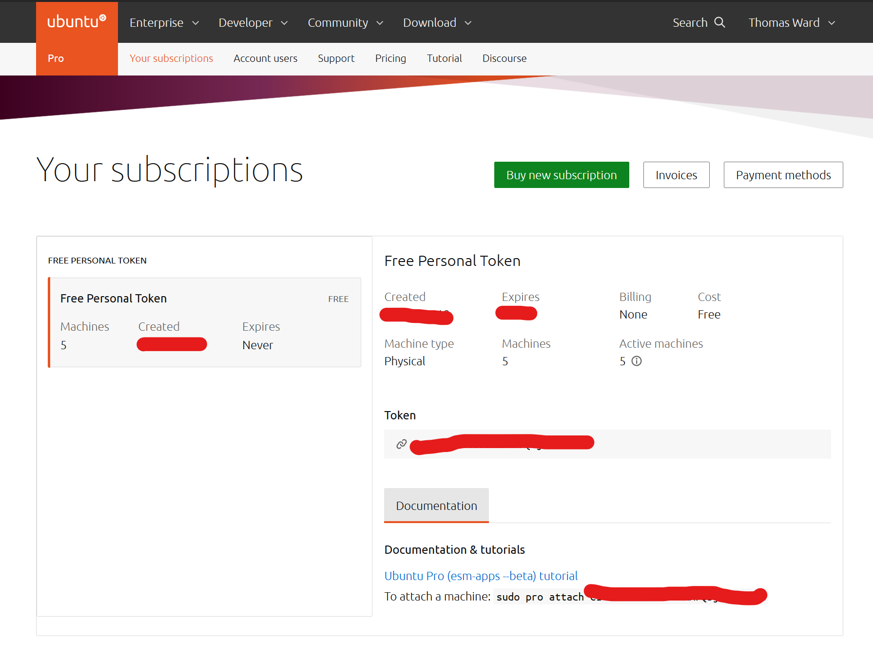 Несмотря на ограничение Pro только для LTS, перейдите на панель управления Pro по адресу https://ubuntu.com/pro/dashboard , и вы увидите список своих подписок. Вы нажимаете на свою подписку, и информация справа меняется на нее. Там, где вы видите токен и документацию, вы видите команду, которую нужно запустить, чтобы подключить вашу систему к Ubuntu Pro, чтоsudo pro attach TOKEN_HERE.