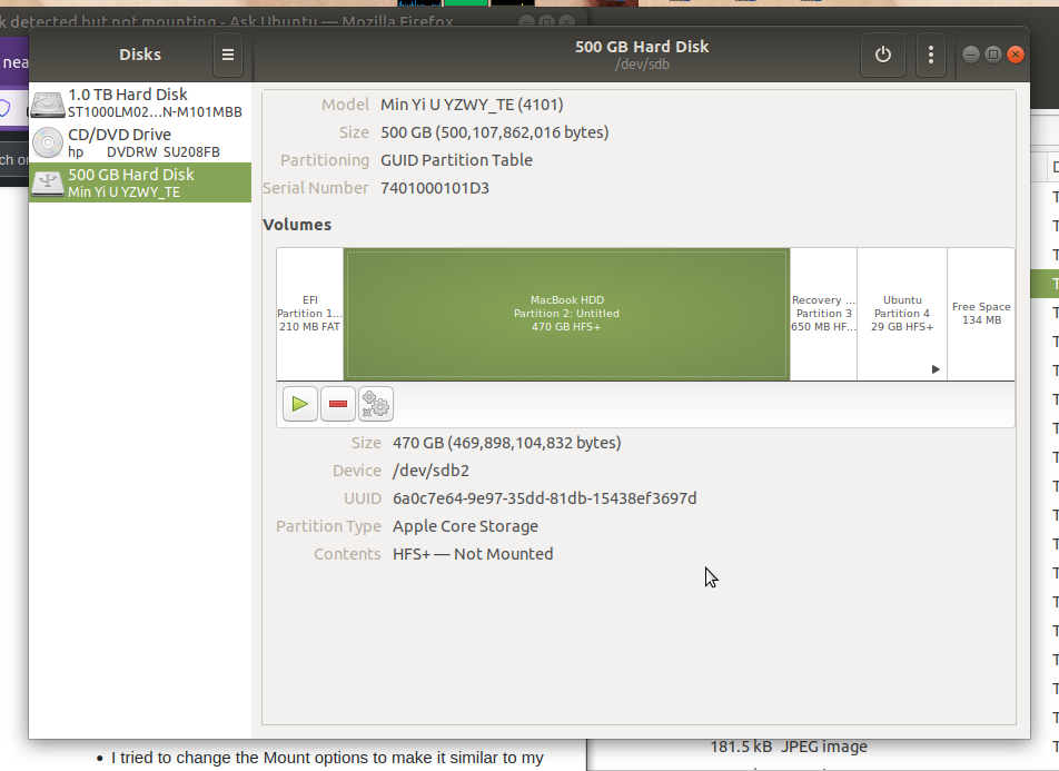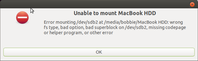 Когда я подключаю 2,5-дюймовый жесткий диск, Ubuntu видит его, но не монтирует. См. снимок экрана. Не удается смонтировать жесткий диск MacBook.