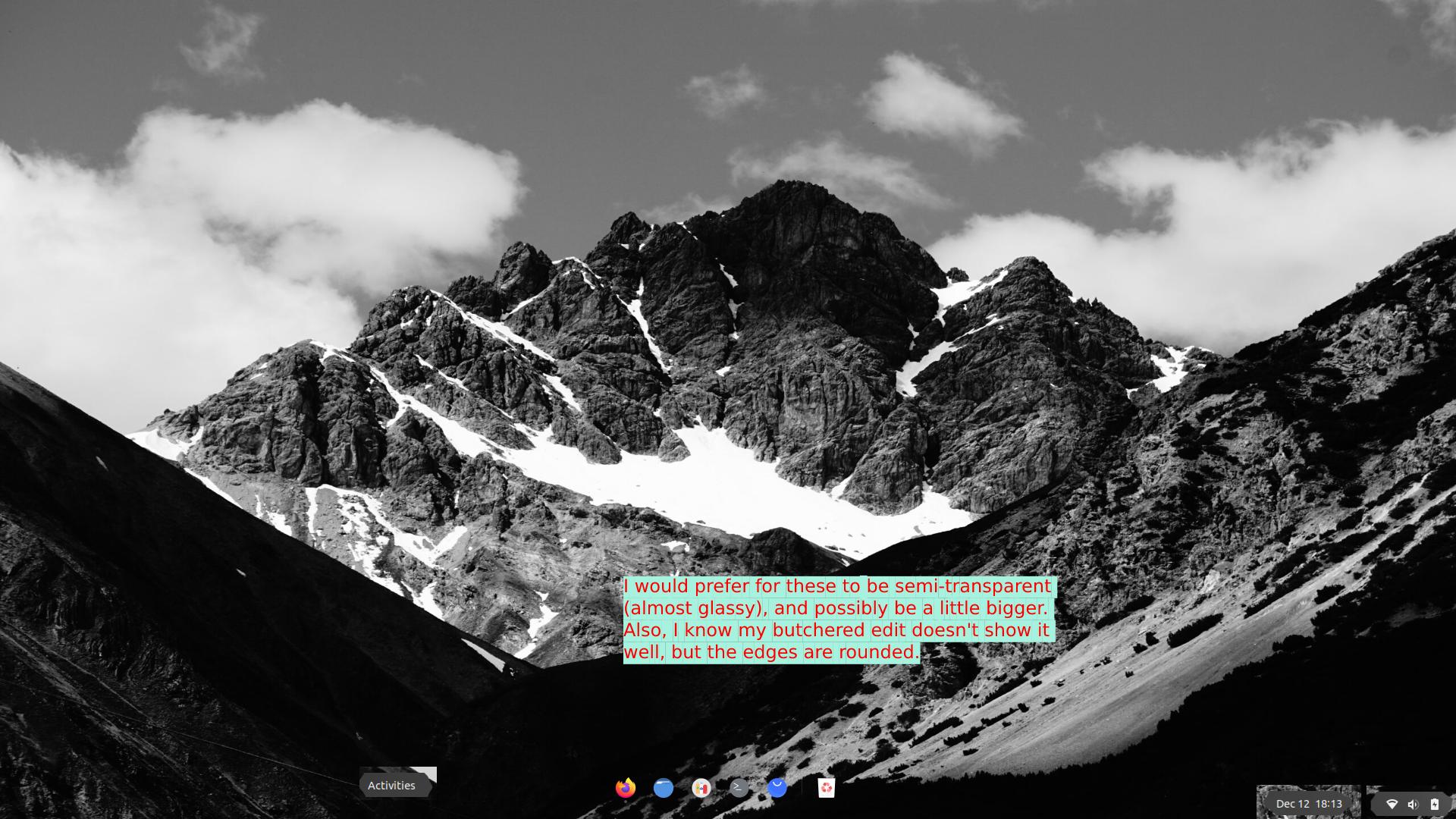 Я новичок в Ubuntu, и я немного настроил рабочий стол по своему вкусу. Моя текущая главная проблема — это верхняя панель, которую я скрыл. Однако спрятаться для меня недостаточно. Мне нравится видеть такие вещи, как погода, время и уведомления, я просто не хочу эту чертову верхнюю панель. Что я хочу сделать, так это полностью избавиться от верхней панели, но оставить определенные элементы, такие как отображение даты/времени/уведомлений, погода и вкладка действий, на рабочем столе, предпочтительно перетаскивая их туда, куда мне заблагорассудится. Я также хотел бы иметь возможность редактировать/настраивать эти элементы, чтобы изменять такие вещи, как цвета, значки, формы и размеры. Прикреплены несколько изображений, чтобы показать, с чем я работаю, а также (урезанное) изображение того, что я хочу иметь: