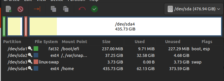 Я использую Ubuntu 22.04.2 LTS. Ниже приведена моя текущая конфигурация таблицы разделов. Изначально я выделил 37 ГБ для корневого раздела, а оставшееся место оставил для домашнего раздела. Однако я понял, что корневой раздел в настоящее время требует больше места.