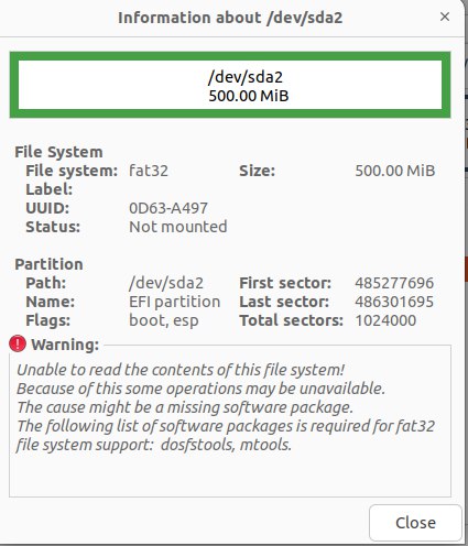 Я изменял размер раздела Linux (Ubuntu) с LiveCD (USB) с помощью gparted, поэтому я также переместил раздел EFI. Теперь имя моего раздела EFIdev/sda2, а имя раздела файловой системы —dev/sda3, они оба на устройстве SDA. Gparted печатает следующую информацию о разделе EFI:сообщение об ошибке от gparted