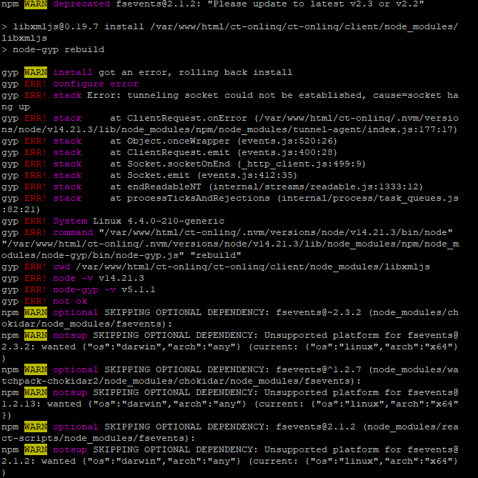 Я пытаюсь установить интерфейс React на Ubuntu 16.04. Я использую версию узла 14.21.3 и версию npm:6.14.18. Я также использую глобальную версию node-gyp 9.4.0. Я все еще получаю сообщение об ошибке восстановления node-gyp. Делюсь скриншотом кода ошибки. Пожалуйста, помогите мне запустить интерфейсную часть. код ошибки см. изображение здесь