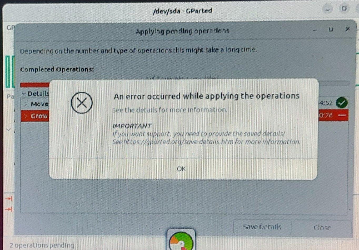 Операция gparted завершилась неудачей почти через 10 часов