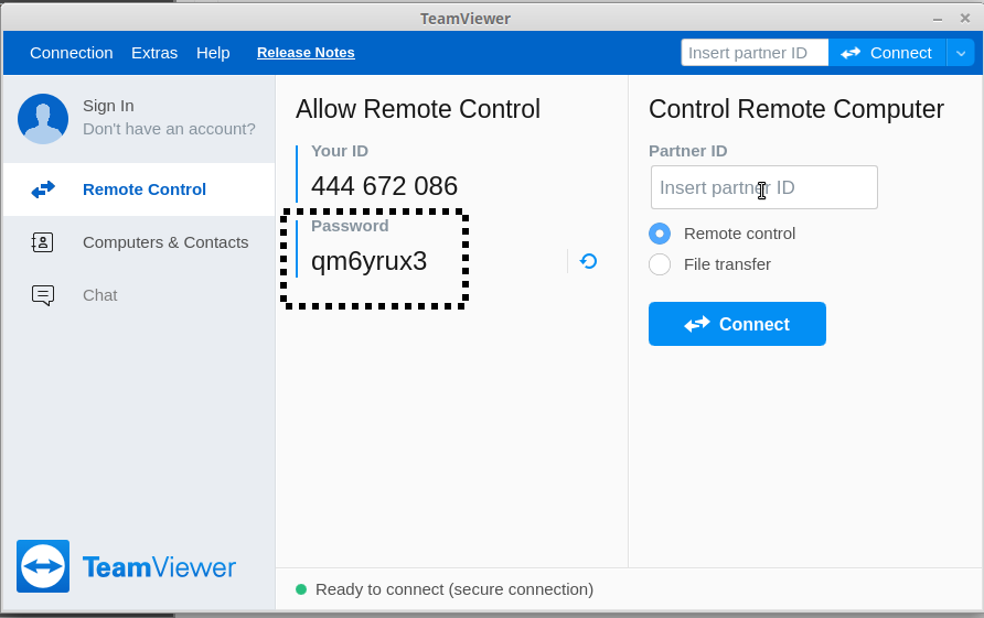 Эту информацию можно легко получить в окне, открывающемся TeamViewer при его запуске. Это окно показано на следующем рисунке, где пароль (qm6yrux3) выделен пунктирным прямоугольником: