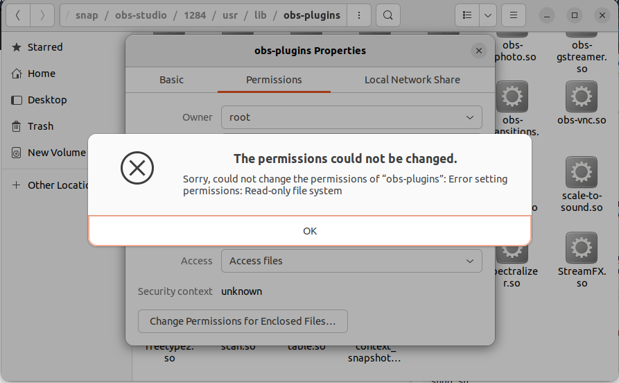 приводит к тому, что я открываю его какadmin:///snap/obs-studio/1284/usr/libоднако эта опция ВСЕ ЕЩЕ неактивна. Попытка Ctrl+V приводит к этому сообщению об ошибке.