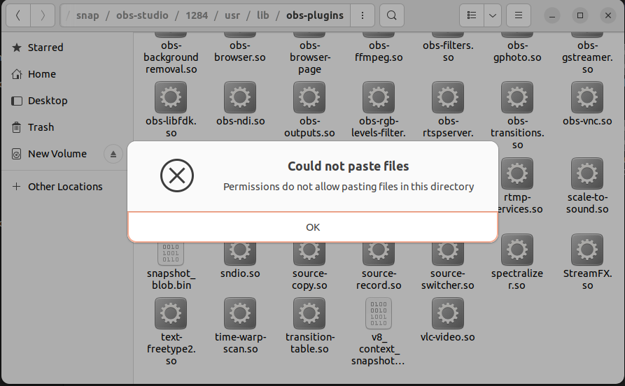 Я пытаюсь скопировать и вставить плагин для OBS в разделе/snap/obs-studio/1284/usr/lib. Он находится в корне. Опция вставки неактивна: